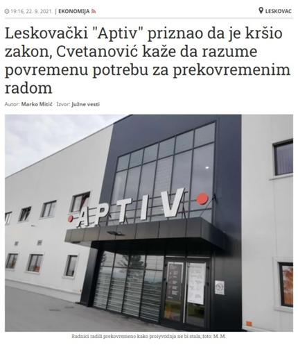 Aptiv je dospeo u centar interesovanja medija kada su se radnici pobunili zbog dvanaestočasnovnog radnog vremena. Naime, po rečima predstavnika sindikata ove fabrike, polovinom 2021. godine, od 4.000 radnika oko 900 zaposlenih je otišlo na bolovanje jer su dve nedelje morali da rade po 12 sati dnevno. Nekoliko dana je ispred fabrike dežurala Hitna pomoć jer su radnice pri kraju napornog radnog dana padale u nesvest. Posle pisanja medija i pritužbi sindikata Aptiv je vratio radno vreme na osam sati, ali sedam dana u nedelji.